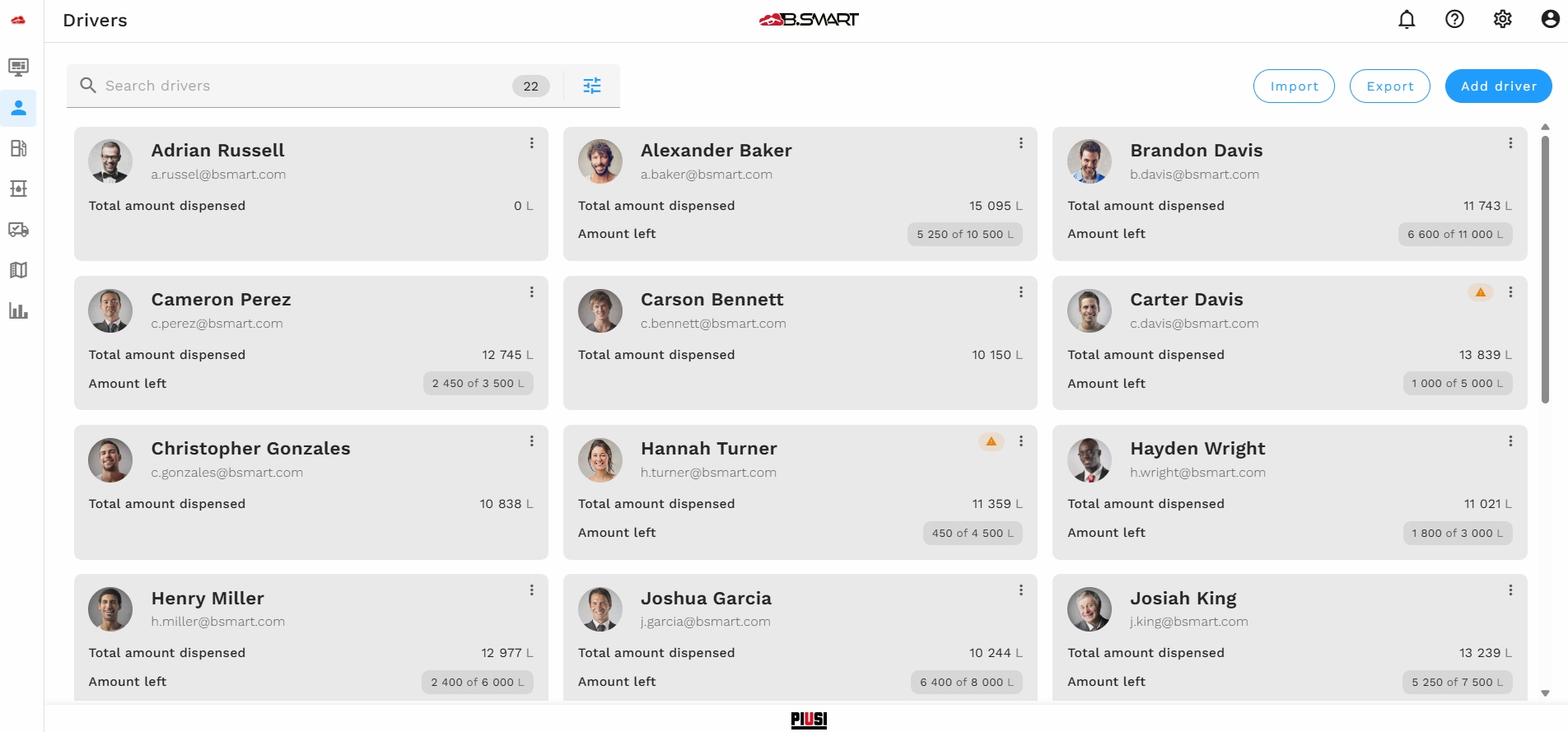 PIUSI B.SMART: como su nombre indica en inglés, ¡es inteligente! Se trata de un sistema de gestión de combustible simple e intuitivo, que consta de dispositivos y aplicaciones (una para los conductores y otra vía web en la nube para los gestores de la flota) y funciona con tecnología Bluetooth para supervisar y gestionar con facilidad cualquier flota, desde la más pequeña hasta la más grande.